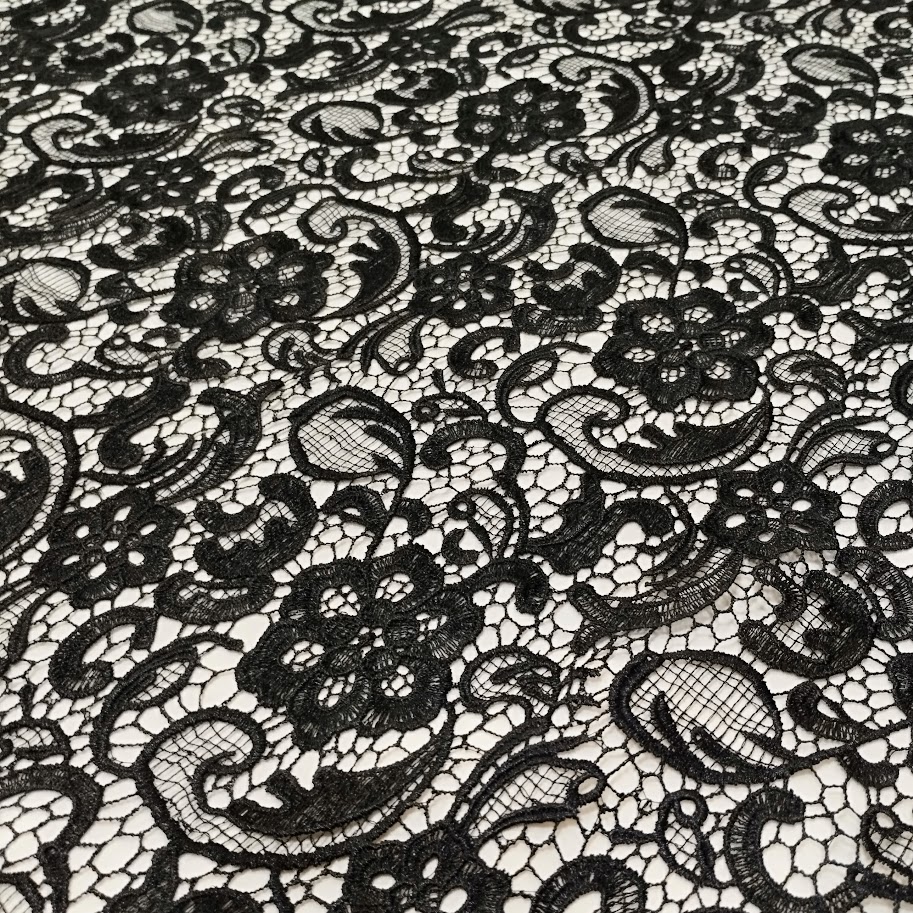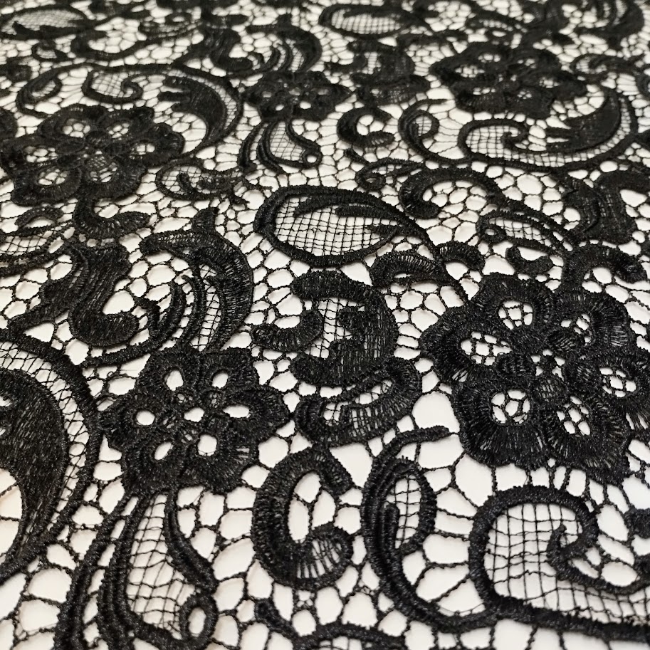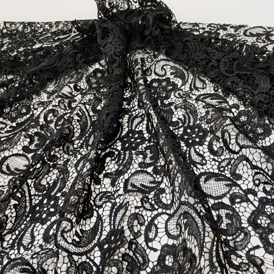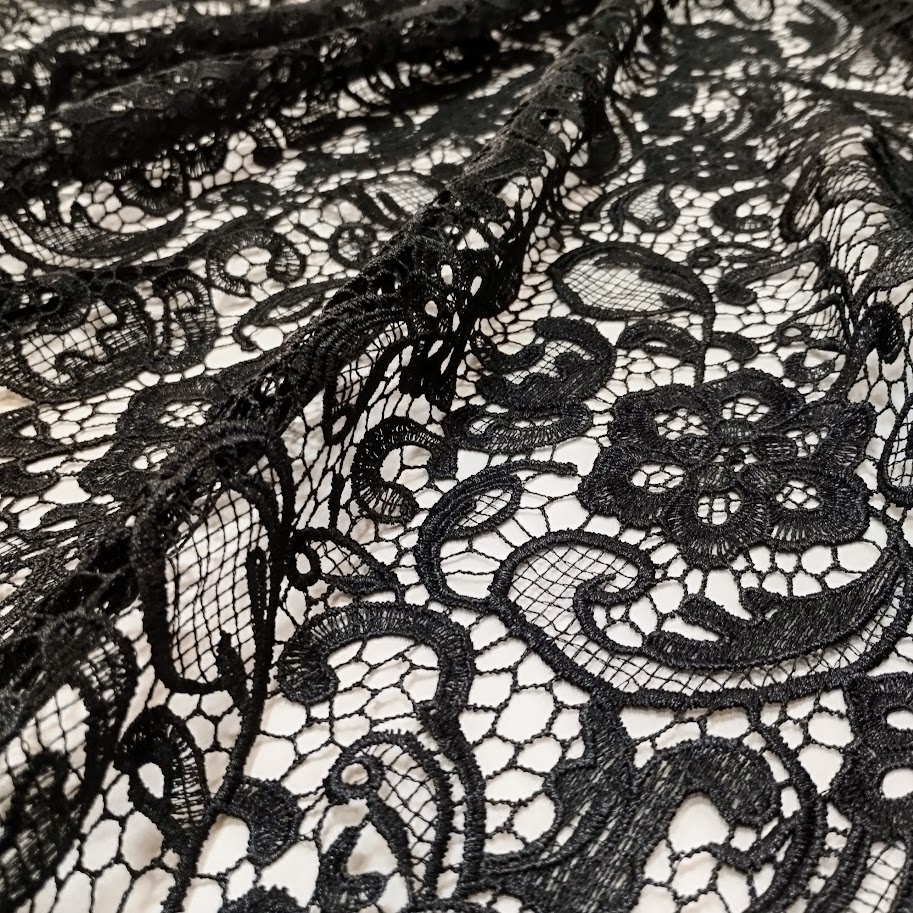 Queda solo 1 metro disponible de este exclusivo encaje de guipur negro. Una oportunidad ideal para adquirir un tejido de alta calidad a mitad de precio. Se vende en un solo corte, perfecto para proyectos especiales que requieran distinción y elegancia sin renunciar al ahorro.