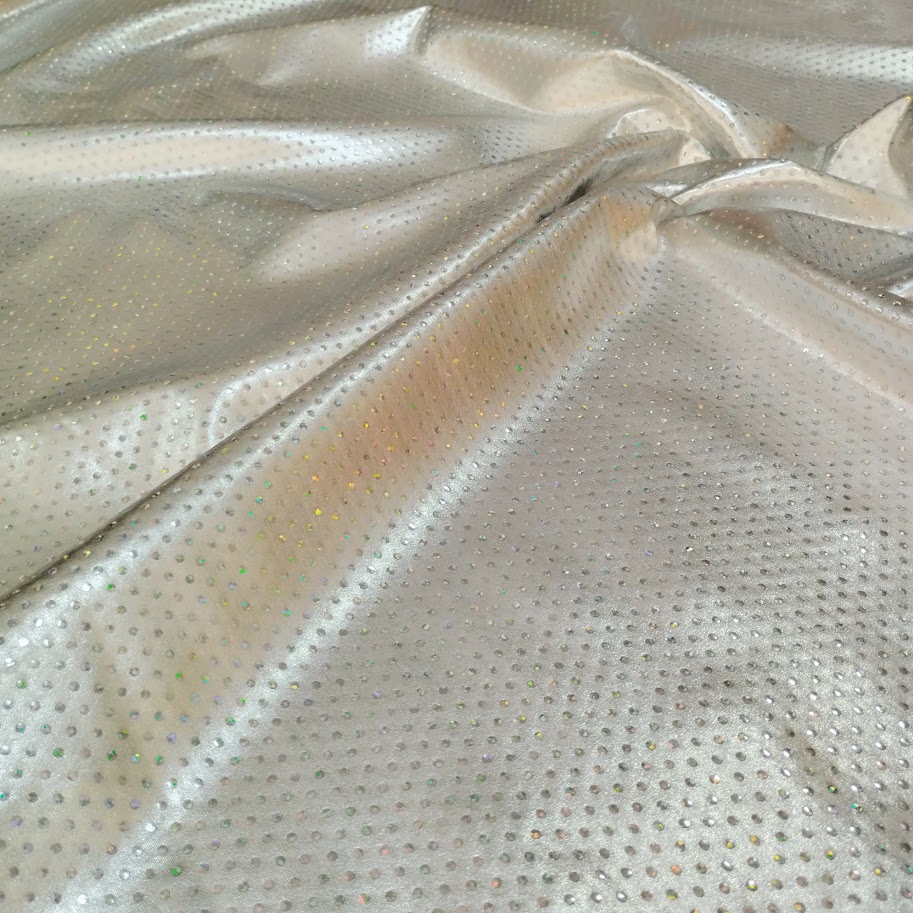 Lycra metalizada plata con incrustaciones tipo Swarovski: ideal para vestuario escénico, danza y shows. Brillante, elástica y única.