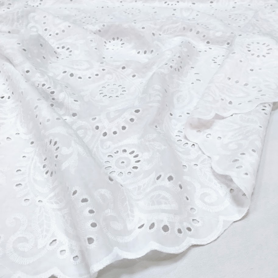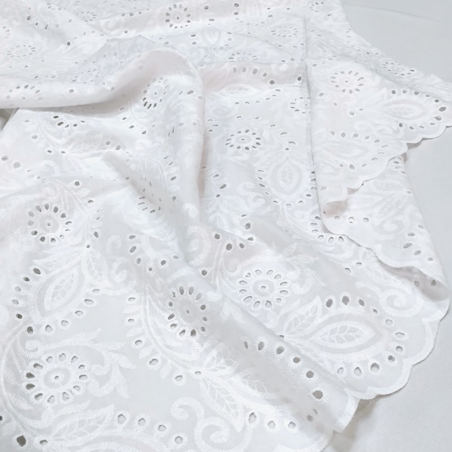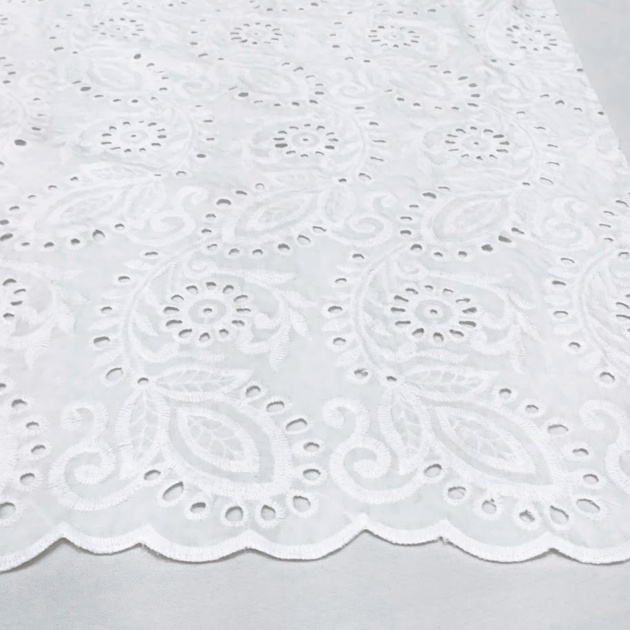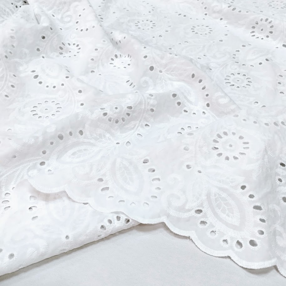La tela de batista bordada y perforada es un tejido de algodón ligero que destaca por su elegancia natural y su delicado trabajo decorativo. Confeccionada con hilos finos y decorada con bordados y calados que permiten el paso del aire, esta tela es ideal para crear piezas con un toque romántico y auténtico. Además, incorpora orillo doble, lo que facilita su manipulación y mejora la estabilidad de los bordes durante la confección.