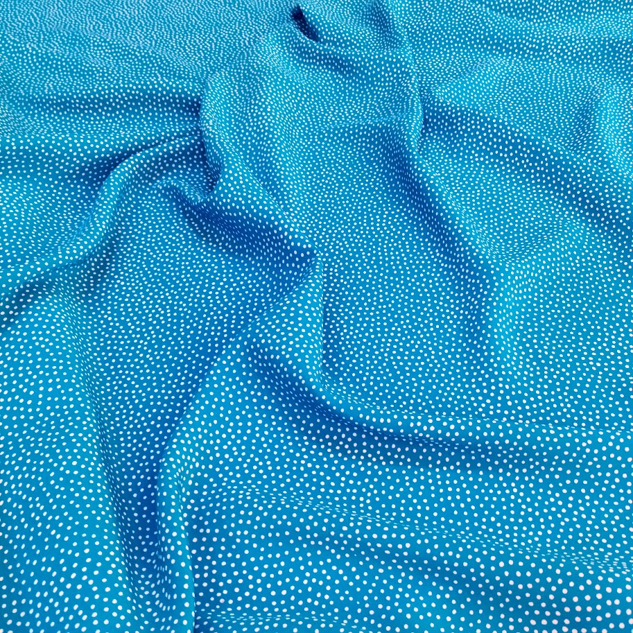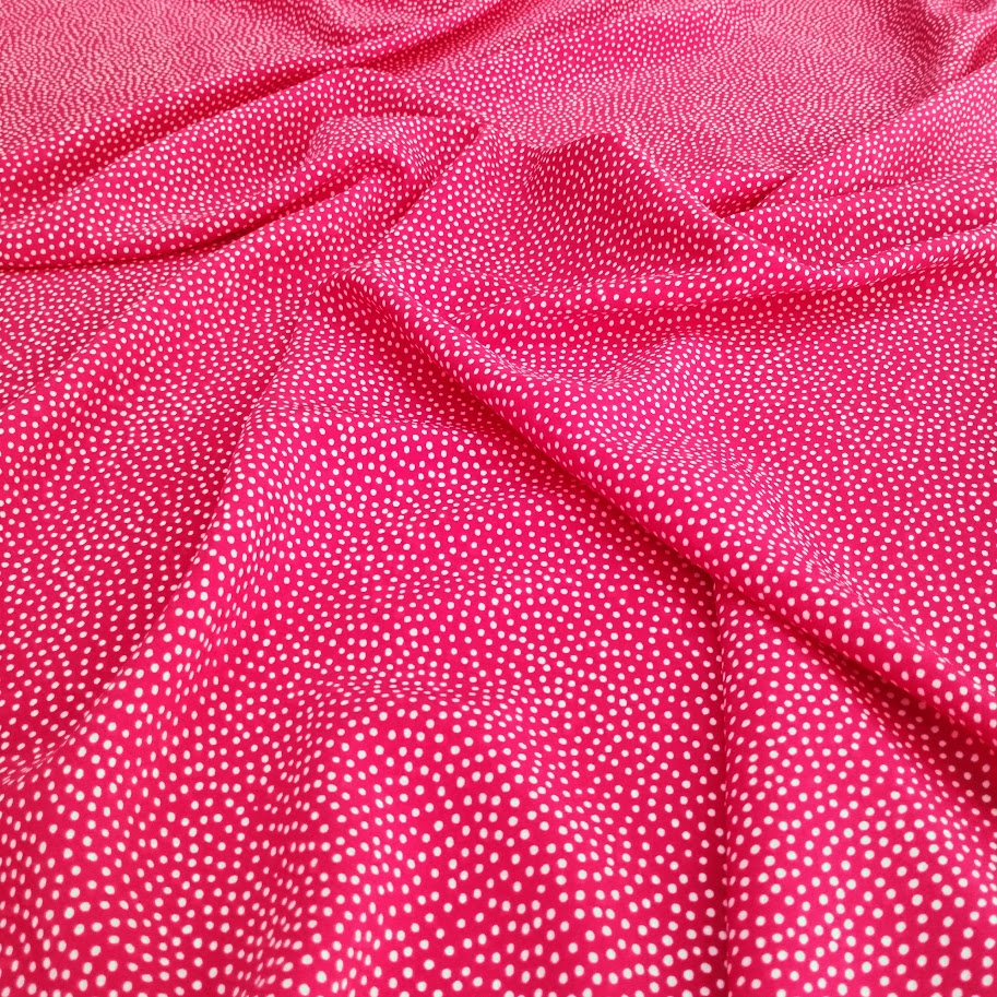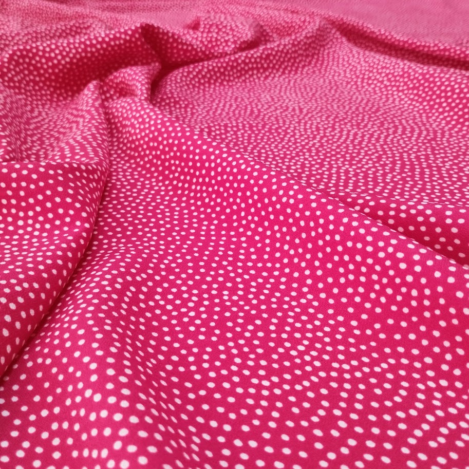 Disponible en dos tonos vibrantes —fucsia y turquesa con topitos blancos—, esta tela es perfecta para confeccionar blusas con caída, vestidos fluidos, pantalones anchos y faldas vaporosas. Su estampado de topitos le da un aire fresco y desenfadado, ideal para prendas de entretiempo o verano con mucha personalidad.