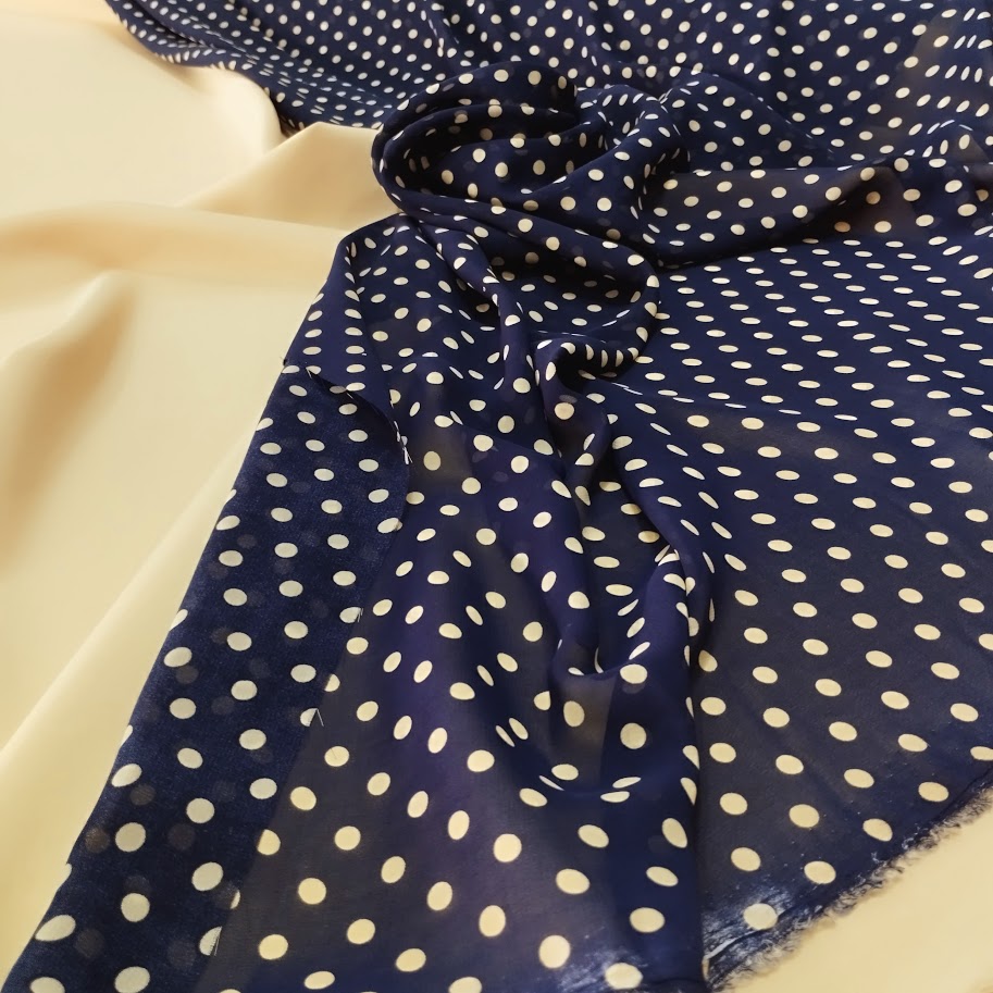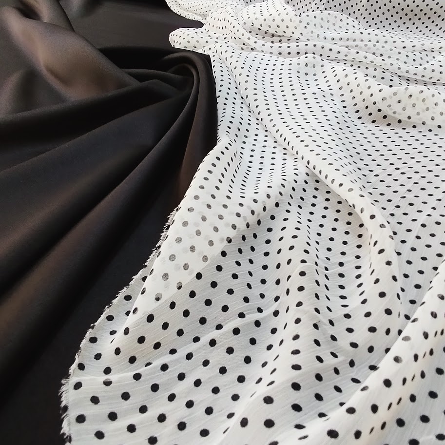 La tela de gasa con lunares combina muy bien con Tejido de Crep «Zena» y Crep Satén “EVA”, creando conjuntos equilibrados y llenos de estilo. Tanto si quieres realzar el diseño con un contraste o prefieres el mismo tono, la transparencia de la gasa dejará relucir la elegancia y fluidez de ambos tejidos.