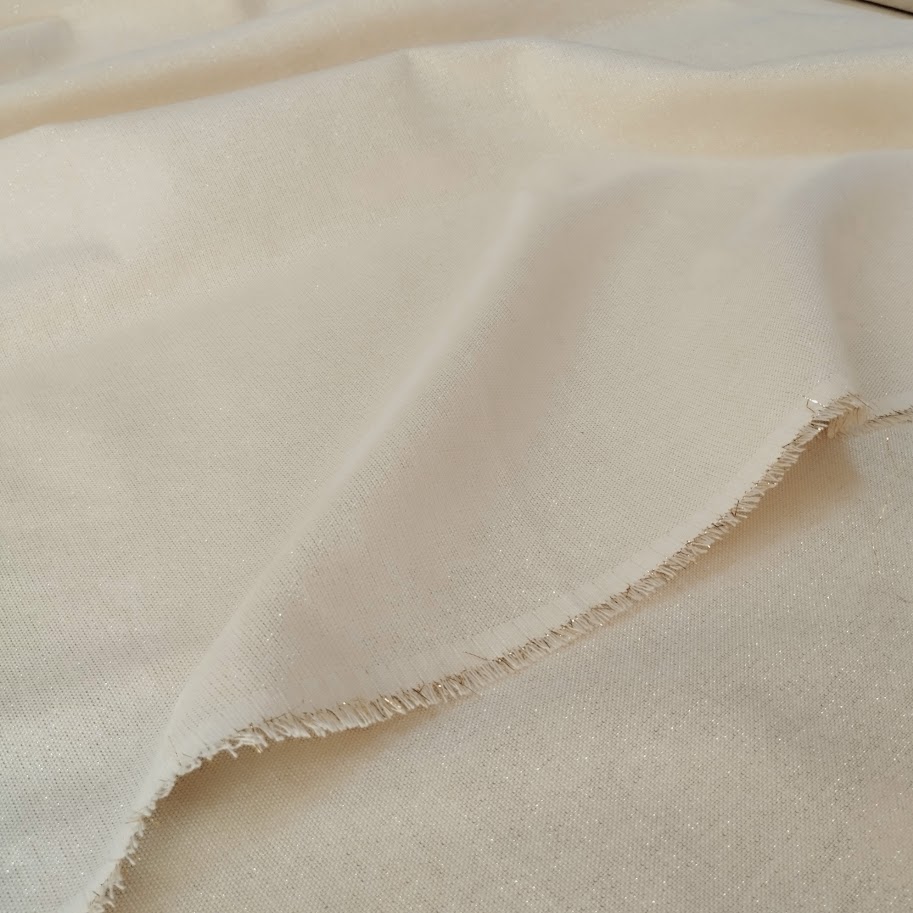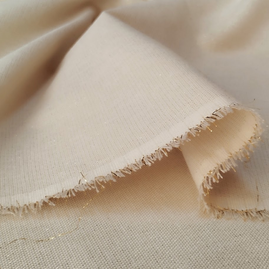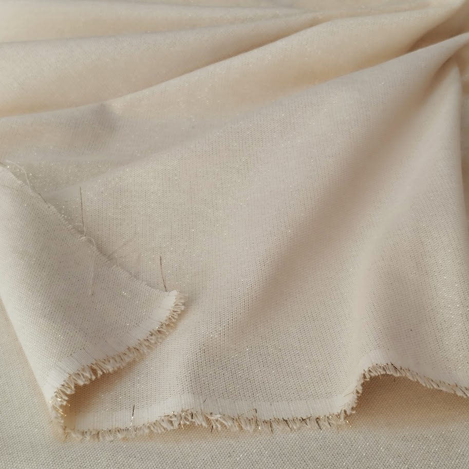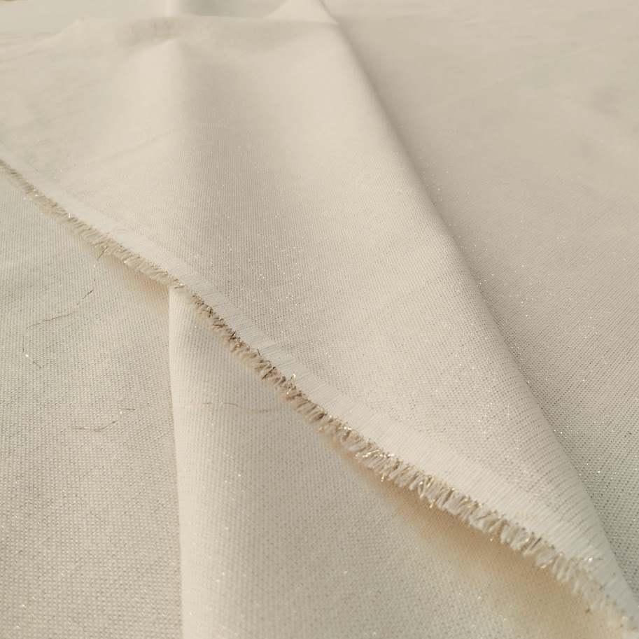 Tela «semi Panamá» doble ancho, color crudo Natural con hilo lurex dorado.