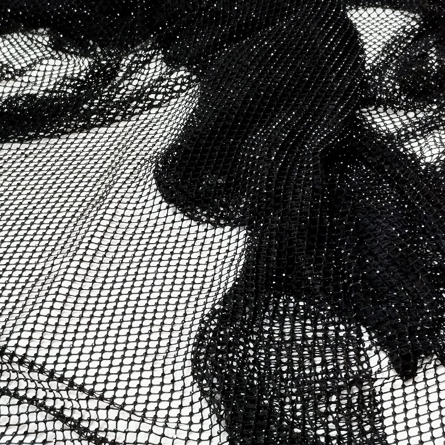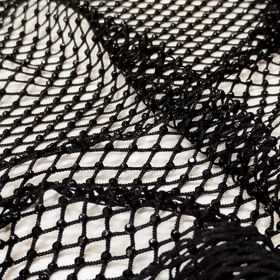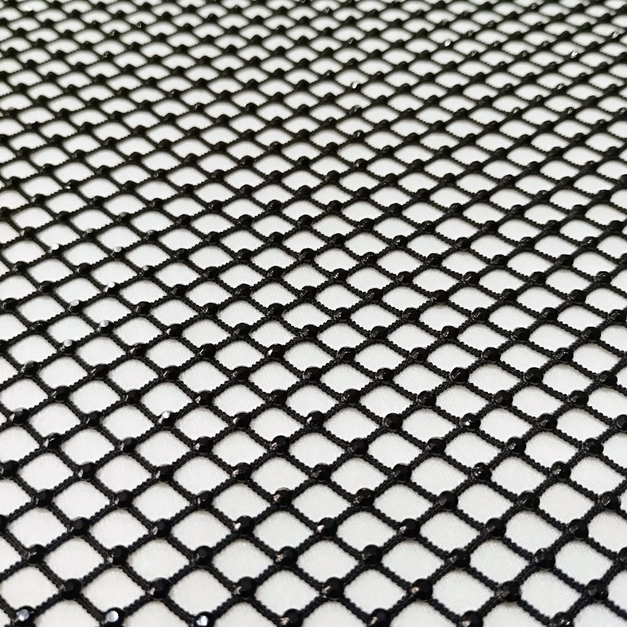 Esta tela de pedrería de red elástica de diseño geométrico está compuesta por rombos interconectados, y en cada punto de cruce brilla una piedra negra que atrapa la luz de forma sutil pero poderosa. El resultado: un efecto visual hipnótico, perfecto para looks sofisticados, escénicos o de alta costura con un toque vanguardista.