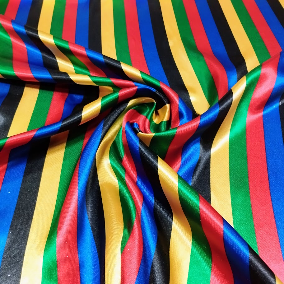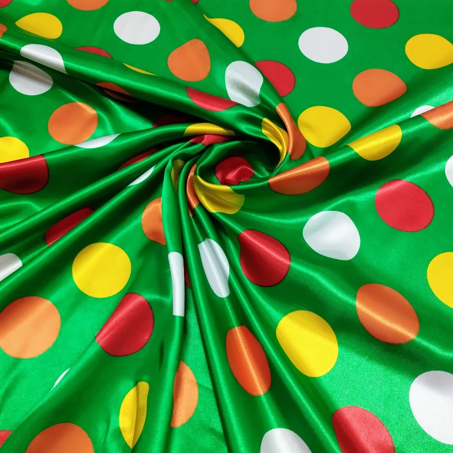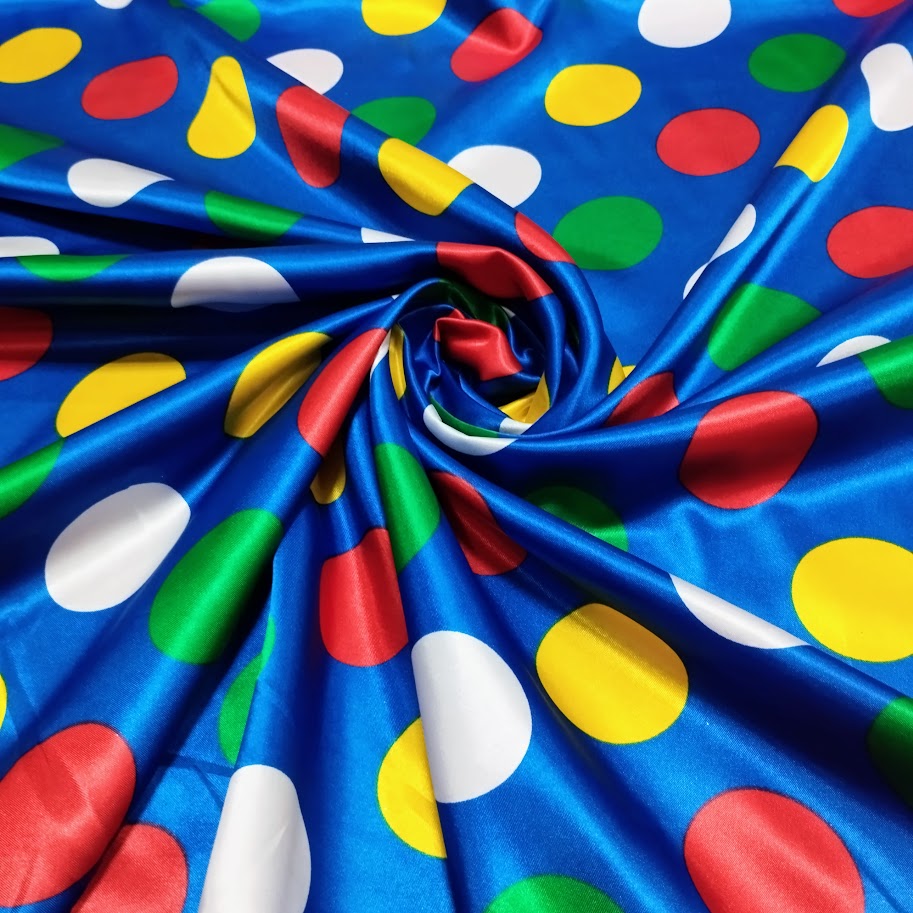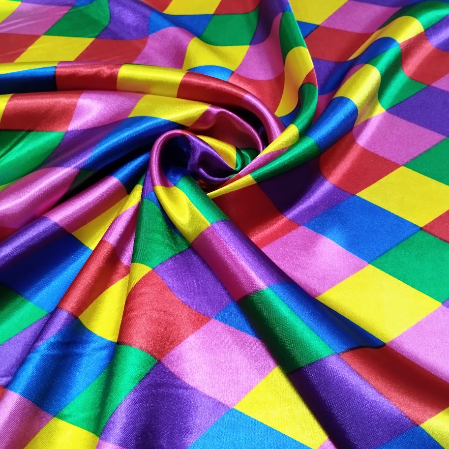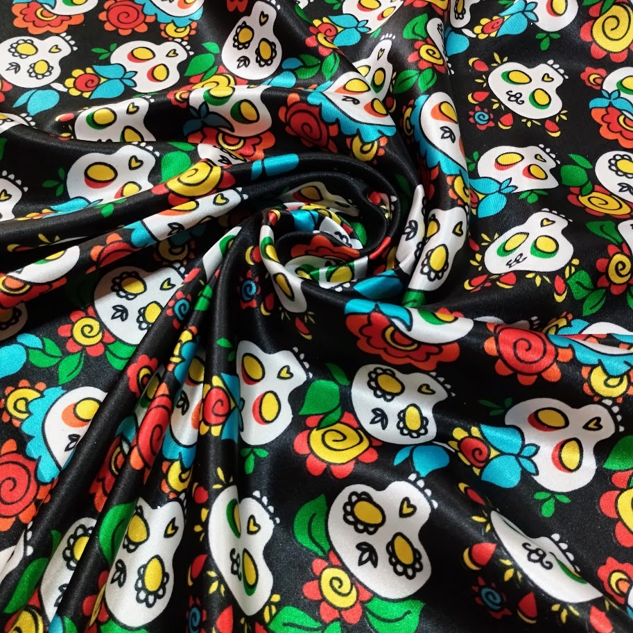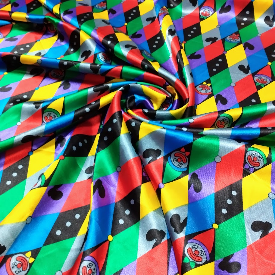 Raso estampado brillante, económico y de caída fluida. Ideal para disfraces y decoración. Combínalo con raso liso, tul o gasa para crear piezas únicas y llenas de estilo.