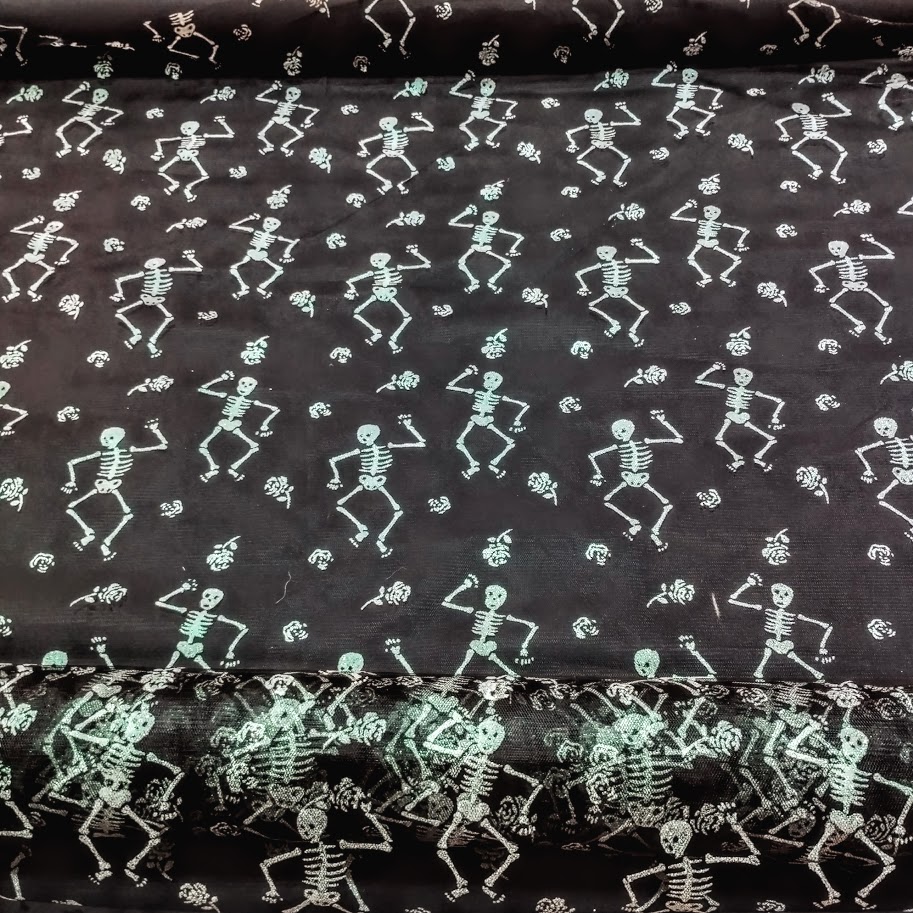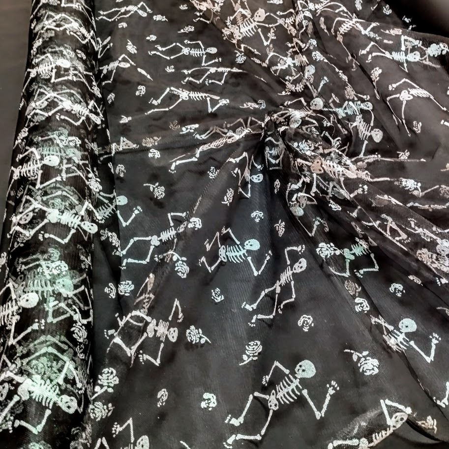 Tul negro ligero con esqueletos en purpurina plata y verde flúor. Perfecto para disfraces, accesorios o decoraciones originales de Halloween.